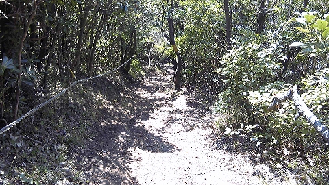 ようやくこう配が緩やかになって、右に下る道がある。「塩満方面」と書いてある。わずかなアップダウンの続くこの付近は、麓の塩満集落の入会地であったようで、塩満広場というぽっかり開けた空間がある。そのあたりには第二次大戦時に本土決戦用に掘られたのか、海に向けた地下砲台の跡もある。
