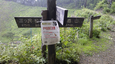 「クマ注意」の張り紙。周囲に人がいないのでクマ除け鈴は必携です。
