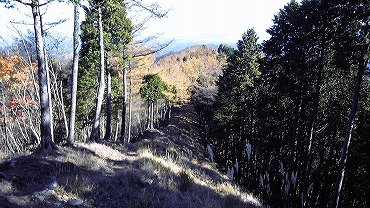 さて、ほぼ中間点の塩沢分岐までは予定どおり登ったのだが、ここからなかなか進まない。地図で見るより距離があるのと、日が傾いてしんしんと冷え込んで足が思うように上がらなくなってきたのである。こうした場合は休憩をとればけっこう回復するのだが、何しろ寒いので体を止めるのがつらいのである。
