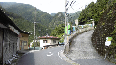 小河内小中学校までかなり歩いたような気がしたので、バス停で停留所の表示をみてみると、まだこの先に3つか4つバス停がある。この分だと30分で着くのはは難しいと思っていたら、結局峰谷バス停まで40分かかった。ここまで来ると、はるか山の上に奥集落らしきいくつかの屋根が見える。ただし、あと30分で着くとはとても思えない。