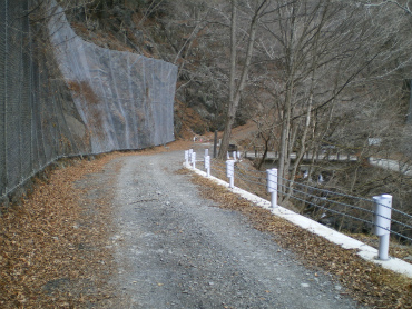 車道をしばらく進むと、後沢林道の入口である。けっこう立派な道だと思っていたら、しばらくは人家があって、電線も道路沿いに続いていた。その電線がなくなったのに気付いたのは30分くらい歩いた頃。そのしばらく先の片倉谷の分岐にはゲートが閉まっていて、ここから先は車両通行止となる。路肩が崩れたり落石があったりして、つい最近工事されたと思われるところも多くあった。