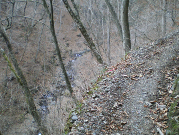 青岩谷の登山道入口に着いたのは4時10分前。予定より30分オーバーしている。あたりはもう薄暗い。後からラジオを聞いたら、この日は冬至だった。1年で一番日が短いのだから当り前である。道幅はいっぺんに狭くなり、左手は深い谷。ちょっと怖い。