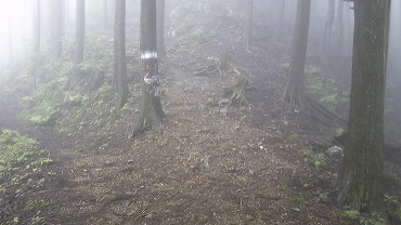 さて、堰堤付近の谷筋から尾根筋に上がるところはで少々きつい思いをしたが、あとは比較的なだらかな坂が続く。駅からは雲の中に見えた山の中腹より上ではずっと霧の中で、展望は開けないものの涼しくて気持ちがいい。ネット情報によると、このコースは標高が低く夏は暑いのが難点と書いてあったが、この日はそんなことはなかった。