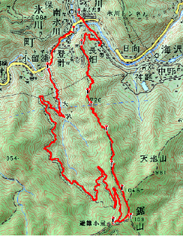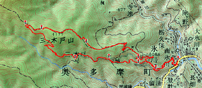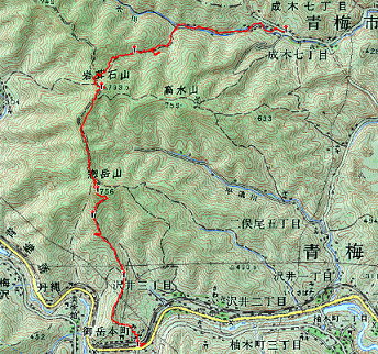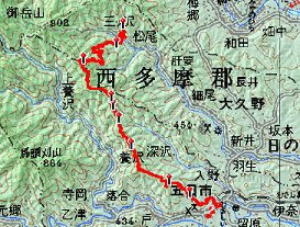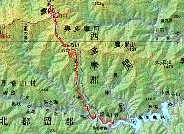 この日の計画は、8:30に奥多摩駅を出て、愛宕神社を経由して鋸山に11:00に着き、お昼休みの後2:00には麓に下りお風呂に入って3:25のホリデー快速に乗るというきわめておおざっぱなものであった。普段はもう少し1/25000で予習して、途中の小ピークやそこまでの目標時間を設定しているのに、若干の経験を重ねたこともあって、油断していたようだ。