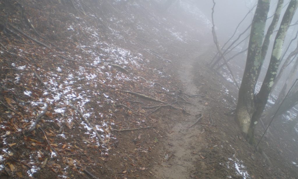 標高が上がるにつれて、道はぬかるみとなっている。昨日の雪が解けたのだろう。登り坂では相変わらず足がぴくぴくするので、そのたびにスポーツドリンクを飲んでいたらとうとう1.8リットルの在庫がなくなってしまった。あと水分はヴィダーインゼリー1パックしか残っていない。ここまで来たらがんばるしかない。