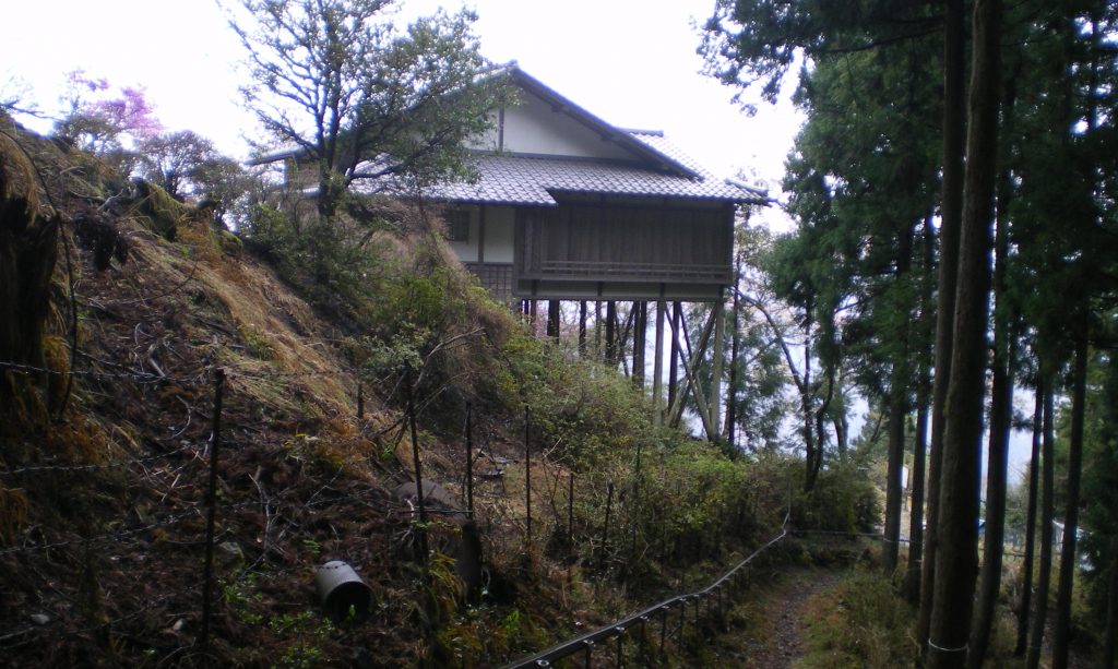 いよいよ登山道に入る。勾配はそれほど急ではなく、路面も落ち葉で歩きやすい。20分ほど歩くと突然廃屋が登場したのには驚いたが、ここから杉林の下方向を見るとはるか下に民家の屋根と道路が見える。地図で確認すると小袖という集落はこの下のようなので、数十年前にはここにも人が住んでいたのだろう。