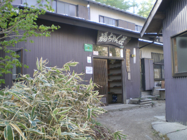 ここから福ちゃん荘までは20分ほどの登りのはずだったが、20分では着かなかった。登山道と並行して下の方に車道が見えるので迷いはしないのだけれど、なかなか着かないので少しあせる。と思っていたら藪の向こうに建物が見えた。福ちゃん荘は正面売店側からの写真がよく知られているが、登山道からは裏手から入ることになる。
