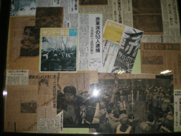 玄関の奥に、皇太子ご夫妻の写真がたくさん飾られている。その中に、額1つだけ赤軍派事件の新聞記事があった。コピーで複写したものは白いままなのだが、当時の新聞や週刊誌の切り抜きはみんな変色している。もはや、過激派とか学生運動は前世紀のできごとになってしまったようだ。