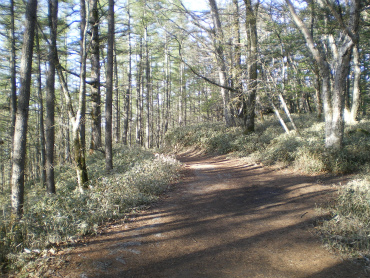 浅間尾根を下る。この尾根はなだらかな下りと急勾配がかわるがわる現われるが、なだらかな部分はいい雰囲気です。避難小屋から神社鳥居まで約1時間半。