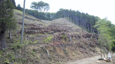 鋸山林道を半分くらい来たあたりで、上方を振り返る。ガードレールの見えるあたりから、手前の山をずっと回り込んで下りてきました。