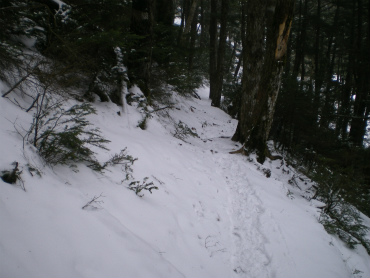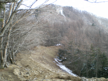 ブナ坂は雪が解けたためか水浸しで、5分ほど登って岩のあるあたりで休憩。3時間のコースタイムに4時間とは、尋常でない遅れ方である。残り半分も4時間かかる計算だと、宿に着くのは7時になってしまう。すでに1000m登ってきたので、かなり疲れもたまっている。これは参った。まだ日が高いのが救いだが、目標は宿に無事に着くことに切り替えざるを得なくなってしまった。