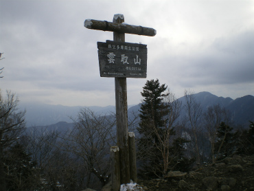 4時45分、ついに雲取山頂2017mに到着。後方は(おそらく)飛龍山で、この谷の奥に前に行った三条の湯があるはず。