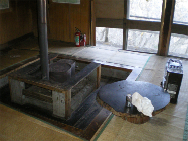 奥多摩小屋内部。薪ストーブはあるけど点いていない。暖房は右側の石油ストーブ1台だけで、小屋番氏は従業員室に引き上げたっきり出てこない。