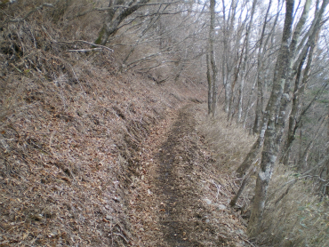 小さな谷を挟んで左に右に巻き道は続く。ほとんど平らなので順調に進むのだけれど、8時半を過ぎても避難小屋が見えてこない。帰りの峰谷発のバスは12時55分、峰谷まで3時間とみて、10時前には下り始めなければ間に合わない。逆算すると、8時半には避難小屋に着いてリュックを置き、鷹ノ巣山に向かうという計画だったのだが、ちょっと無理そうである。