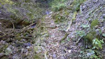 この近道を歩いていて思ったのは、地盤といい、道路際の石垣の造りといい、丹波天平の高畑集落跡への道とそっくりということであった。確かに地理的には近いので似ていて不思議はないのだが、あちらは山梨県、こちらは東京都である。ほとんど人が通らないのに電柱が続いて建っていたり、バイクか何かが走った形跡がみられるのもよく似ていた。