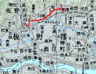 二番極楽寺に向かう右手には、阿波と讃岐を隔てる阿讃山脈(讃岐山脈ともいうが、徳島側ではそのように呼ぶ)が見える。源平争乱時だから空海の時代より400年ほど後になるが、源義経が屋島を急襲する際、この道を通って阿讃山脈を大坂峠で越えたという。ちょうど、現在高徳線が通っている経路である。