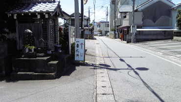 坂東駅の前、まっすぐ伸びる道を進み突き当たりで左に折れる。門前通りと言う名前の商店街であるようだ。しかし、猛暑日の昼下がり、真上から日光が降り注ぐ中、歩いている人は誰もいない。交差点にはお遍路用の道しるべが描かれている。写真を撮ったりしながらゆるゆると進むと四つ角に差し掛かる。