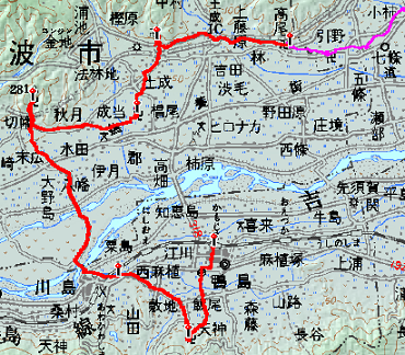 この日の行程は、JR板野を下りてほぼ真西へ向かう。四国北部を西から東に流れている吉野川の左岸を遡上することになる。