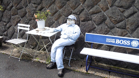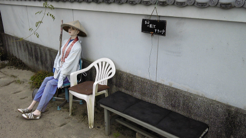 四番大日寺から坂道を下り脇道に入ったところにある喫茶店の前に、等身大の人形が椅子に座っていた。これはTVとかWEBかで見たことがある。四国のどこかの過疎の村で、案山子(かかし)の人形を作っている人がいて村のあちこちに置いているというあの人形である。