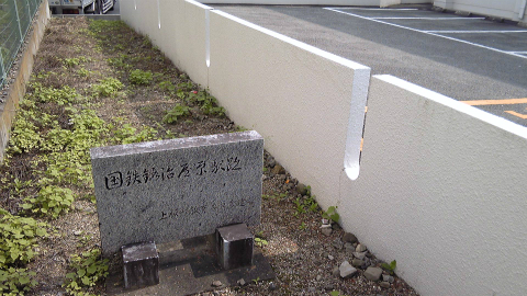 さて、記念碑は駐車場にあるのだったかなと思い出しながらそれらしいところを探すと、銀行と隣の建物の境い目、どちらの土地か判然としないあたりに記念碑はあった。じかに地面に置かれている上、それほど大きいものではないので目立たない。「国鉄鍛冶屋原線跡」と読めるが、特に来歴や説明書きはなく、もうしばらくすると何の記念碑なのか分からなくなってしまうような気もする。