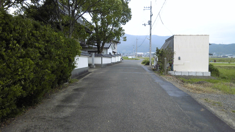 しばらく進んだあたりで、昔はそれなりの旧家であったと思われる古いお屋敷の庭が、もう誰も住んでいないのが明らかなほど荒れ果てていた。よく見ると、家の側面の土壁が骨組みだけになってしまって、あとは何かのきっかけで倒壊するのを待つだけのようだ。こんなに道路近くにあるのに、親戚なり縁者がいて後片付けをしないのだろうか。