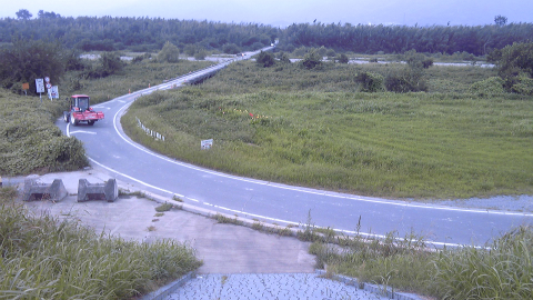 吉野川を突破、川島潜水橋上の堤防の上から、来た道を振り返る。この時点ではまだ雨、傘を差しながらの撮影。