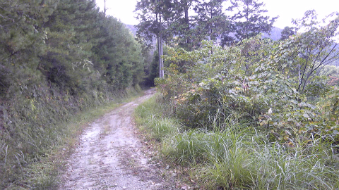 柳水庵を下りてすぐの林道は自動車も走っていて、道路の上には「吉野川市」と表示がある。へんろ道は林道をまたいで南側に伸びていて、かなりの急坂である。しかし次第に傾斜が楽になり、ほとんど遊歩道のような道になった。
