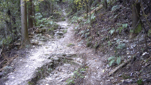 標高差300mくらいなら大したことはないと高をくくっていたが、さすがにここはきつかった。朝早くから登り下りして、直前では浄蓮庵から標高差300mを下ったばかりである。息は切れるし膝は上がらないし、途端にスピードが落ちた。それでも、手を使わないと登れないような場所はなかったから、きついと感じたのは朝からの疲労とあとは精神的なものが大きかったようである。