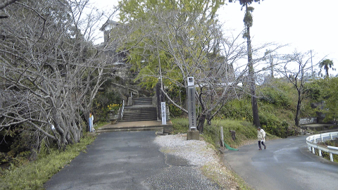 やっと着いた、と思ったら、細かな砂利道の参道には、右方向にも左方向にも「本堂まで500m」と表示がある。ということは、いま歩いている参道は円周を描いていて、本堂は現在の場所の反対側にあるらしい。よく見ると、石垣は弧を描いているようである。