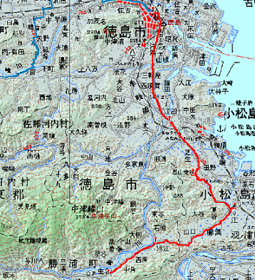 四国電機を過ぎてすぐ、徳島市と小松島市の境である勝浦川を渡る。この頃になると、右手に剣山に至る稜線が近づいてくる。いちばん奥の頂は雪をかぶって白くなっている。この日の道のりは、いま渡った勝浦川からいったん離れた後、再び川に沿って遡上することになる。