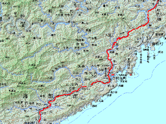 薬王寺を過ぎてどこまで歩くか。薬王寺のある日和佐の次の駅は山河原(やまがわら)、次が辺川(へがわ)、その次が特急停車駅の牟岐(むぎ)であるが、山河原と辺川には各駅停車しか止まらない。歩き始めたら、16km先にある牟岐まで行かないことには、列車も少ないし徳島まで戻るのに時間がかかる。