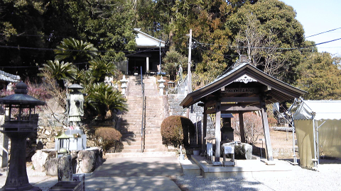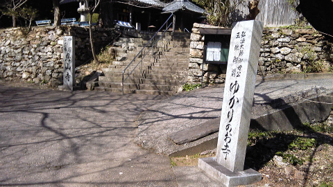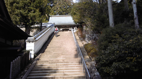 12時20分、お昼を食べてから55分で到着した。「弘法大師御母公ゆかりの地」と石碑が建っている。それはいいのだが、その先に石段、さらに奥にまた石段が見える。平地にあるお寺さんだとばかり思っていたのに、実際はかなり山の上にあるのであった。