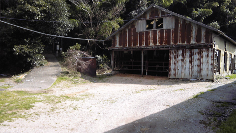 5分ほど下ると、さびたトタンでできた建物に行き当たった。中は暗くてよく見えないが、においからするとどうやら牛舎のようだ。本堂レベルからここまで、門前町らしい店など全く見当たらず、出てきたのが牛小屋なのであった。