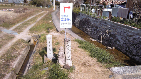 ようやく山の中から、小川に沿った田舎道に下りてきた。案内される道は民家の裏、小川の脇へと続いている。ひとつ間違えるとひとの家の庭に入ってしまいそうだが、ロータリークラブの案内に加えて古くからの「へんろ道」石碑もあって分かりやすい。道はやがて、舗装道路の通りに出た。バス停があるので幹線道路なのだろう。