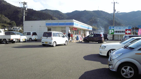 山の中を曲がりながら下りて行く舗装道路を勝浦川まで下ったところに、ローソンが現れた。コンビニだけでなく、商店も自販機もほとんどない立江寺からの1時間であった。数少ないコンビニだけに、午後3時半という中途半端な時間にもかかわらず駐車場は満杯である。