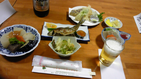お風呂を出ると2階に上がって洗濯物を乾燥機に移し、ちょうど夕飯の時間となった。あゆの塩焼き、こんにゃくのお刺身、野菜のてんぷら、野菜の煮物といった心づくしのメニューで、ぜいたくな夕食とはまた違った味わいがあった。連日、旅館・民宿に泊まっているお遍路さんにとって、胃にやさしい夕飯だと思う。ただし、生ビールはない。