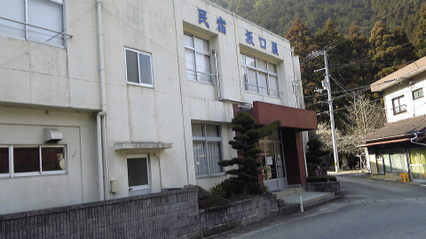 お雛様を飾る数十軒の集落を抜けて、窪地に向けて坂を下って行くと「ふれあいの里さかもと」に着く。校舎自体は鉄筋の4階建てで、使用中の施設でもあることからそんなに古いという感じはしない。「改築して間もなく廃校になっちゃったからね」ということである。校庭はそれほど広くはなく、当時も生徒数は多くはなかったんだろうと思われた。