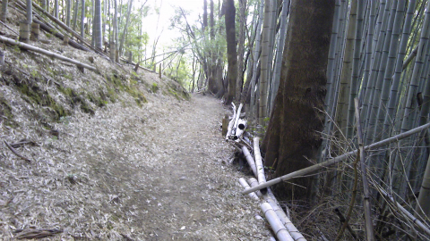 牛舎の横から、人しか通れないくらい狭い幅の道が竹藪の中に続いていて、道案内はそれが立江寺に向かうへんろ道だと言っている。仕方がない。ここを進むしかない。