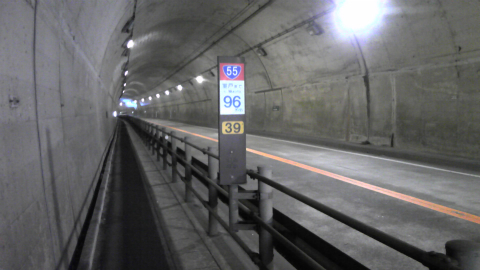 鉦打トンネルの中で、室戸まで96kmの表示。この日はあと30km歩いて残り60km台まで短縮する予定。
