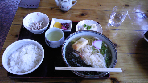 そこで3つめの選択肢である、「厄除けうどん」の大きな看板のあるうどん店・やすらぎに入ることにした。幸い、先客は1人しかいない。せっかくなので、厄除けうどんを定食でお願いする。厄除けうどんには、にしん、かまぼこ、天かす、わかめとお餅が入っていて、定食も白ごはんだったのでお餅とダブってしまった。他に冷奴と小鉢が付く。うどんはまずまずだったが、せっかくだからかやくご飯であったらよかった。