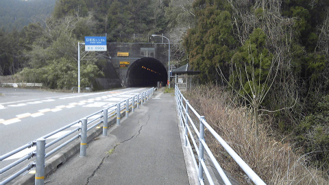 10分ほど休んで再起動。海部木材休憩所からしばらく歩くと、690mの日和佐トンネルである。トンネルの入り口右側には、休憩所としてベンチが置かれている。また、トンネルの中には歩道があり、これまでのグリーンラインとは違って余裕がある。690mは決して短くはないが、トンネルがまっすぐなため出口のアーチが見えるので、距離ほどには長く感じられない。