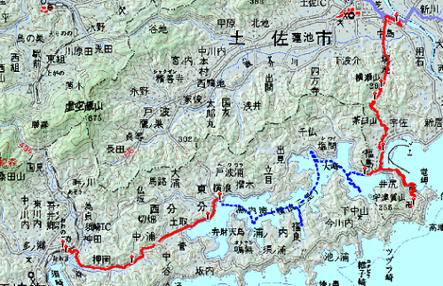 [行 程](→ 高知リッチモンドホテル→)中島バス停 8:45 →(4.0km)9:35 塚地休憩所 9:40 →(0.8km)10:00 塚地峠 10:10 →(3.3km)11:00 宇佐町ファミマ 11:05 →(3.5km)11:50 青龍寺 12:15 →