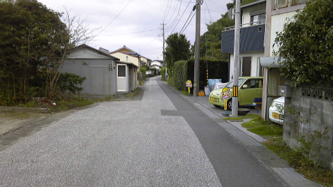 すると、ちょうど先ほどの工事中の道路のあたりに、先ほどとは逆向きに通行止めがされていてガードマンがいたので、たまたま通行止め解除のあたりで左折したようである。ここで正規の道に復帰する。そこからすぐに太い通りを横断し、案内にしたがって古い住宅街に入る。