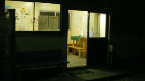 午後6時半を過ぎて、まだ着かない。渡船の時刻は6時40分だから、半分あきらめた。ちょうどバス待ちをしているおばあさんがいたので、「船着き場はどこですか?」と尋ねると、「引き返して左だけど、その先を右に曲がって堤防沿いに行けばいいよ」と教えてもらった。どうやら、行き過ぎてしまったようである。言われたとおり進むと、3、4分で待合室の灯りが見えてきた。