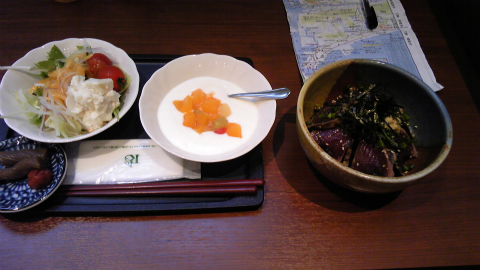高知リッチモンドホテルの朝食はカツオのヅケ丼。ハーフバイキングで、サラダその他はバフェ方式。