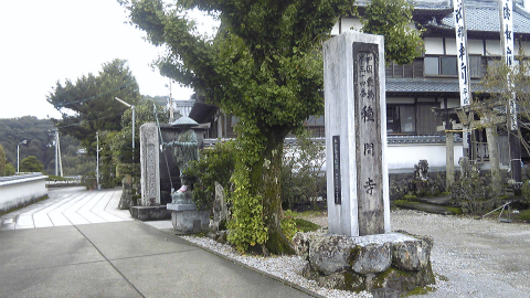 種間寺本堂と参道中央に立つ回向柱。四百年前の住職の遠忌のためと書いてあるようです。