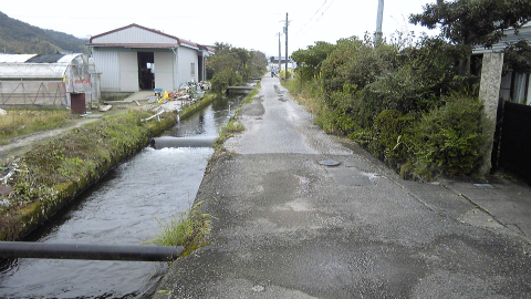 種間寺から西の県道は道路工事中のため、並行する農道に誘導される。すぐ脇を農業用の水路が流れる。