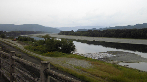 大きな橋である。しばらくは河川敷の上を通っているが、やがて川幅のある仁淀川の上を渡る。雄大な景色である。三方を山に囲まれた上流のような景色であるが、流れはゆるやかである。すぐ先が海なので、もう河口が近いのだ。橋を渡りきるまで10分近くかかった。