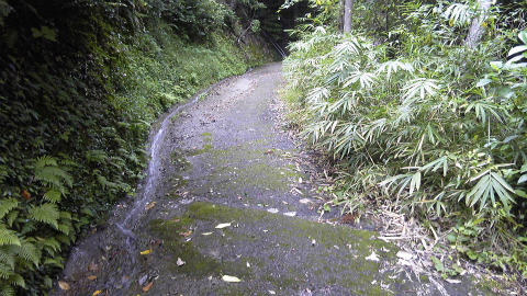 この登山道、驚いたのは道の端に結構な量の水が流れていることである。特に水路が掘ってある訳ではないのだが、どこから流れてくるのか、簡易舗装の上を小川のように水が勢いよく流れている。さすがに清滝という名前がつくだけのことはある。