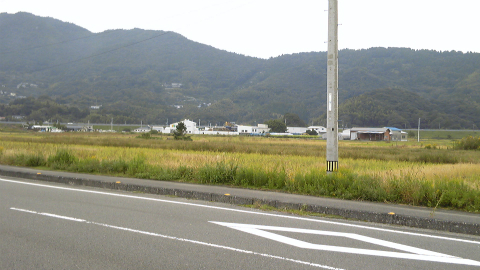 この道路工事は結構長い区間で通行止めにしているようで、向こうの方の農道に普通車が走っているのが見える。いま通っている道は通行止めの道路と平行に走っているはずだが、ちょっと先でスライスしているようだ。左手に見えている山から離れると不安なので、次の角で左に折れる。